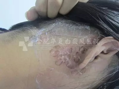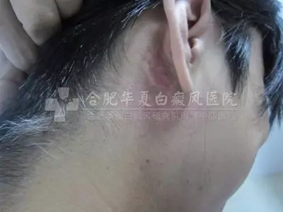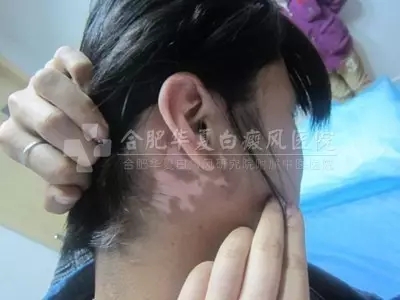 【初来我院就诊时,白斑处色素脱失严重,呈乳白色】