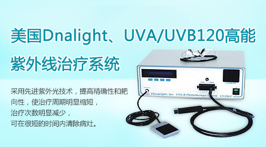 ▼美国TheraLight公司生产的DuaLight UV120-2型高能紫外线治疗仪用于局部治疗白癜风、银屑病、神经性皮炎、硬皮病、脂溢性皮炎、特异性皮炎及湿疹等疾病,安全有效、副作用小。