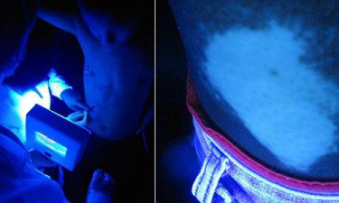 2、多微光学确认白斑:当白斑中开始出现毛囊复色时,复色初期在自然光线下表现并不明显,借助多维光学伍德灯来观察可以确认。