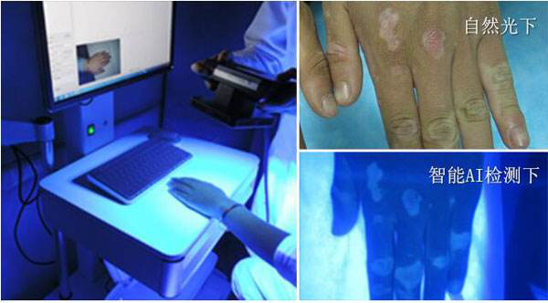 利用皮肤黑色素对UVA光的吸收作用,而失去黑色素的皮肤则产生折光的原理,白癜风智能(AI)成像检测系统,通过采用的LED技术,将获得的波长为365±2nm的长波UVA光源照射病变部位,病变部位产生强弱不一的折光,经高分辨率的彩色传感器,获得病变部位的图像;并通过皮肤影像分析功能,自动对焦和抖动识别,实现皮损部位与正常皮肤的对比,分析色素缺失程度,辨识病症是否为白癜风;同时根据皮损状态下的黑色素细胞形态、数量,自动查找病因,出具诊断结果,并对白癜风实行针对性的有效治疗。