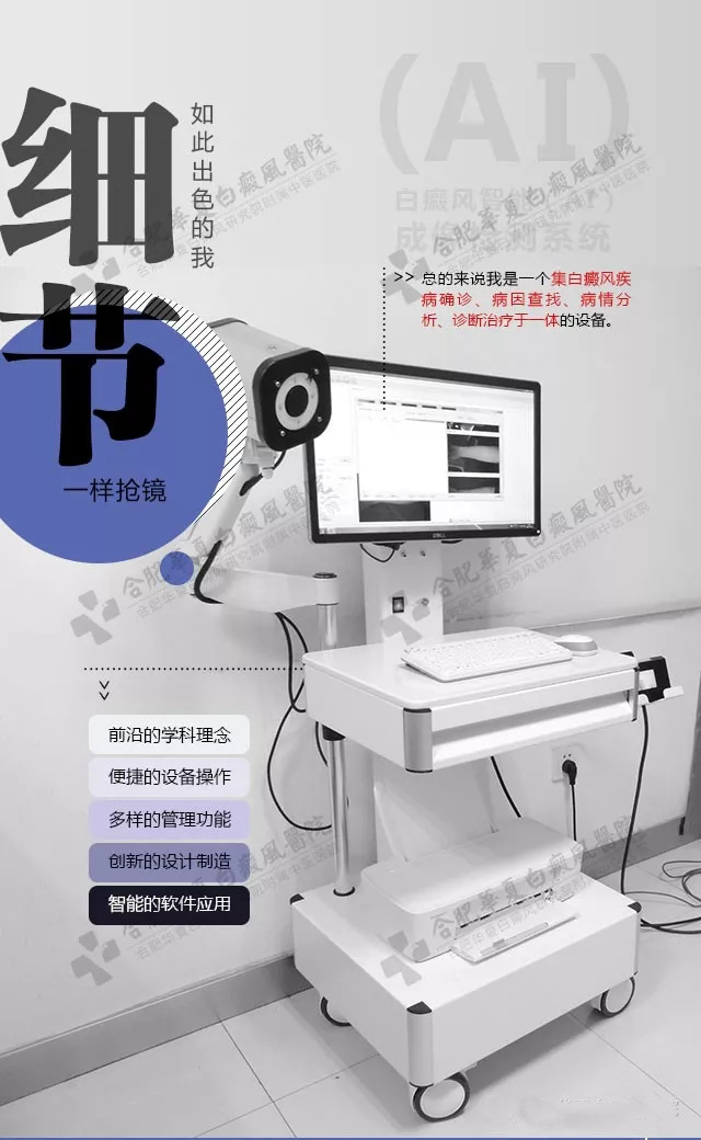 白癜风AI智能成像检测系统,是一套基于白癜风(白斑)专业检测,集白癜风疾病确诊、病因查找、病情分析、诊断治疗于一体的白癜风智能化分析管理系统,其学科理念的前沿性、设计制造的创新性、软件应用的智能性、管理功能的多样性、设备操作的便捷性,是一台现代化专业检测系统。