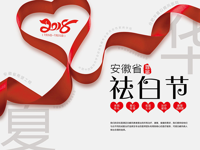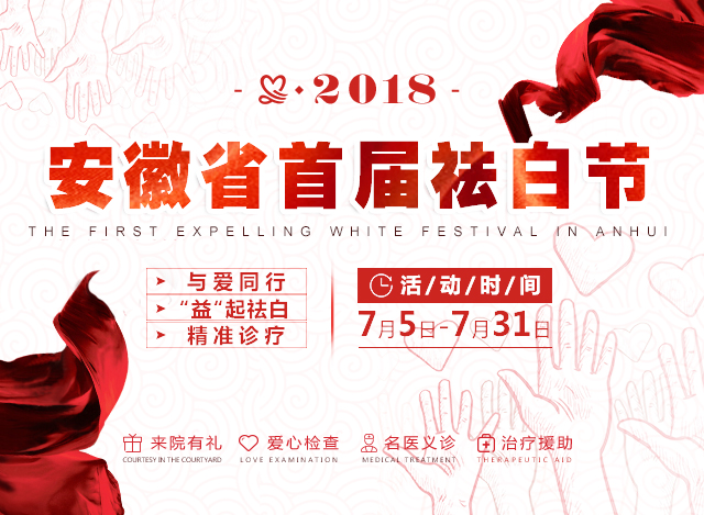 针对安徽省白癜风发病率逐年上升,逐渐低龄化发展趋势,防治形势严峻的情况,经主管部门商榷决定:由省希望工程办、安徽省青少年发展基金会、中国中西医结合学会皮肤色素病学组联合合肥华夏白癜风医院举办2018“安徽省首届祛白节”将于7月5日~31日全面展开,专项定向、专款专用、精准救助白癜风患者;旨在整合全国优势医师资源、精确检测分型、有效治疗项目(方案组合)、优化治疗流程、强化(抗复发)治疗、利民惠民援助治疗措施,引起广大白癜风患者和普通大众对于白癜风疾病的科学重视和知识普及,让广大社会大众能够认识了解、科学预防白癜风。