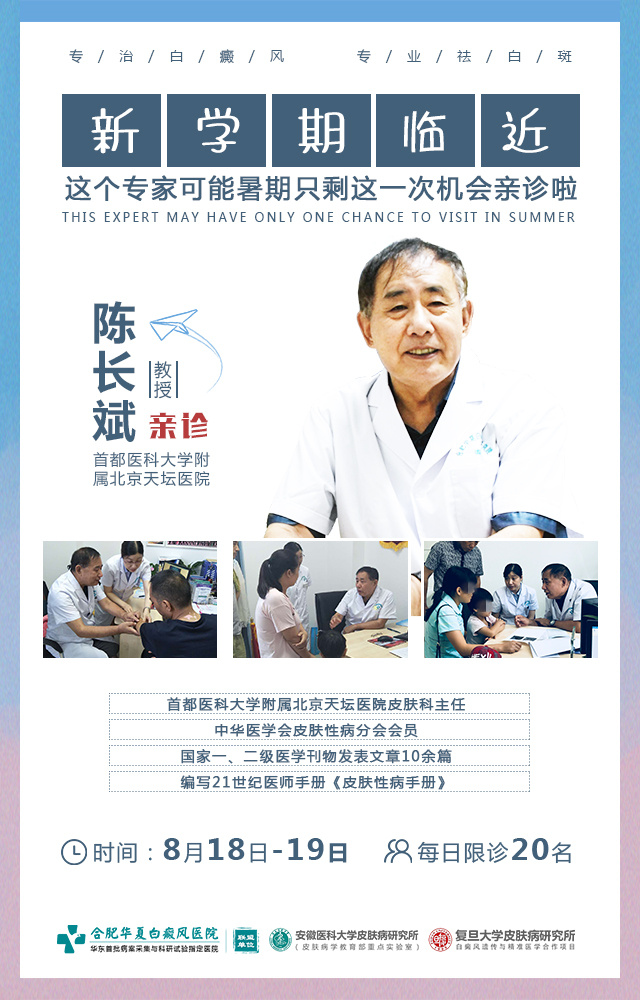 合肥华夏白癜风医院献礼开学季,同时也积极响应国家医改政策,看医师不再“一号难求”,满足广大白癜风患者“规范诊疗提高本地白癜风医疗水平”的现状,于2018年8月18日—8月19日开展为期2天的“京·皖白癜风医师精准会诊”活动,特邀首都医科大学附属北京天坛医院陈长斌教授亲诊,此次会诊汇聚了北京、安徽两地祛白医师,为广大白癜风患者制定个性精细化治疗方案。并且在为患者提供科学治疗的同时,进行实时跟踪,提供积极的心理干预与预防指导,有效辅助白癜风治疗,促使患者康复。