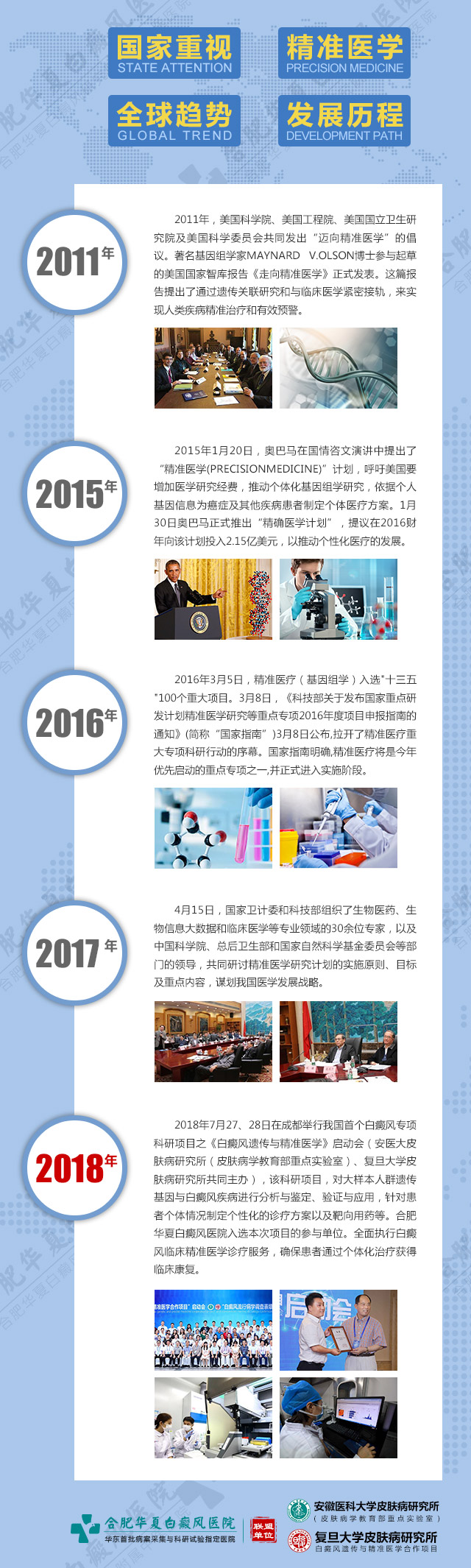 合肥华夏白癜风医院作为此次科研项目标本采集中心,特在2018年9月开展《2018 精准医学临床研讨会推进月暨白癜风个体化诊疗》。全面纳入“精准医学”示范化治疗,届时将由上海市第一人民医院皮肤科教授、中国色素病协会创始人朱光斗教授、美国医学博士伊琳娜·波波娃领衔精准医学医师团联合开展会诊工作,以精准检测和大数据分析结果为依据,将患者内在因素和外在环境结合,有效识别黑色素脱失细胞与正常细胞之间的差别,同时结合美国全新第三代三维皮肤CT检测,从而掌控黑色素生长情况,保障白癜风患者得到最权威的诊疗。一方面,利用病案大数据库推动我国精准医疗的发展,另一方面,造福更多的白癜风人群。