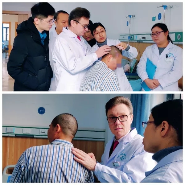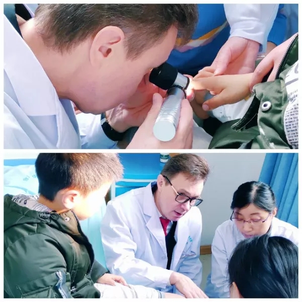 图:安德烈教授和我院医师团共同检查白癜风患者头部白斑